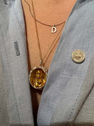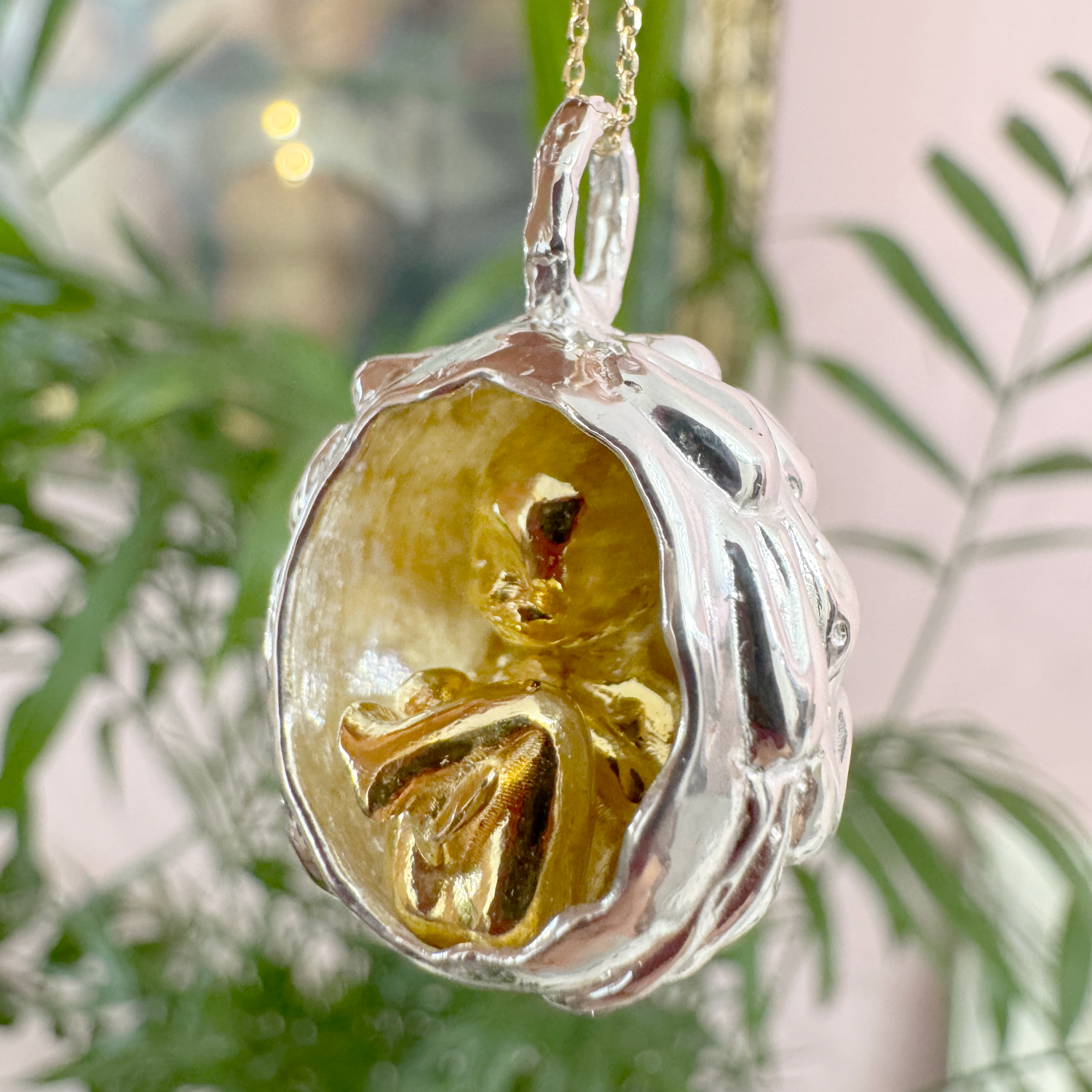 Silver necklace with a gold plated moving baby and a gold plated chain.