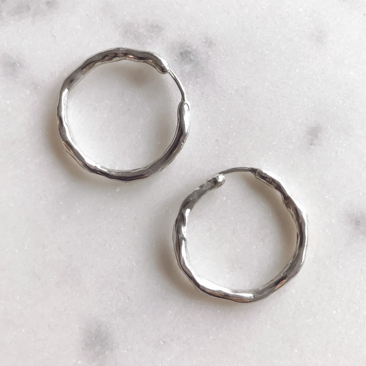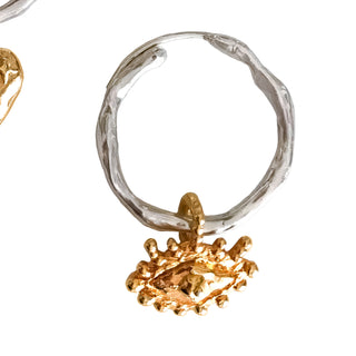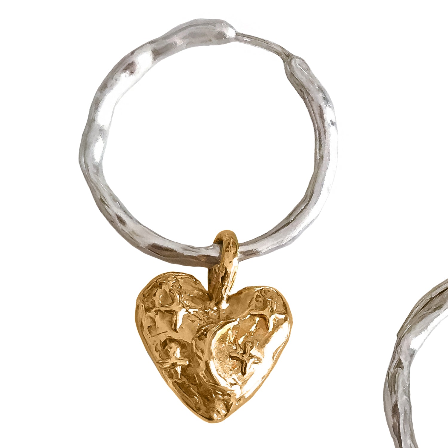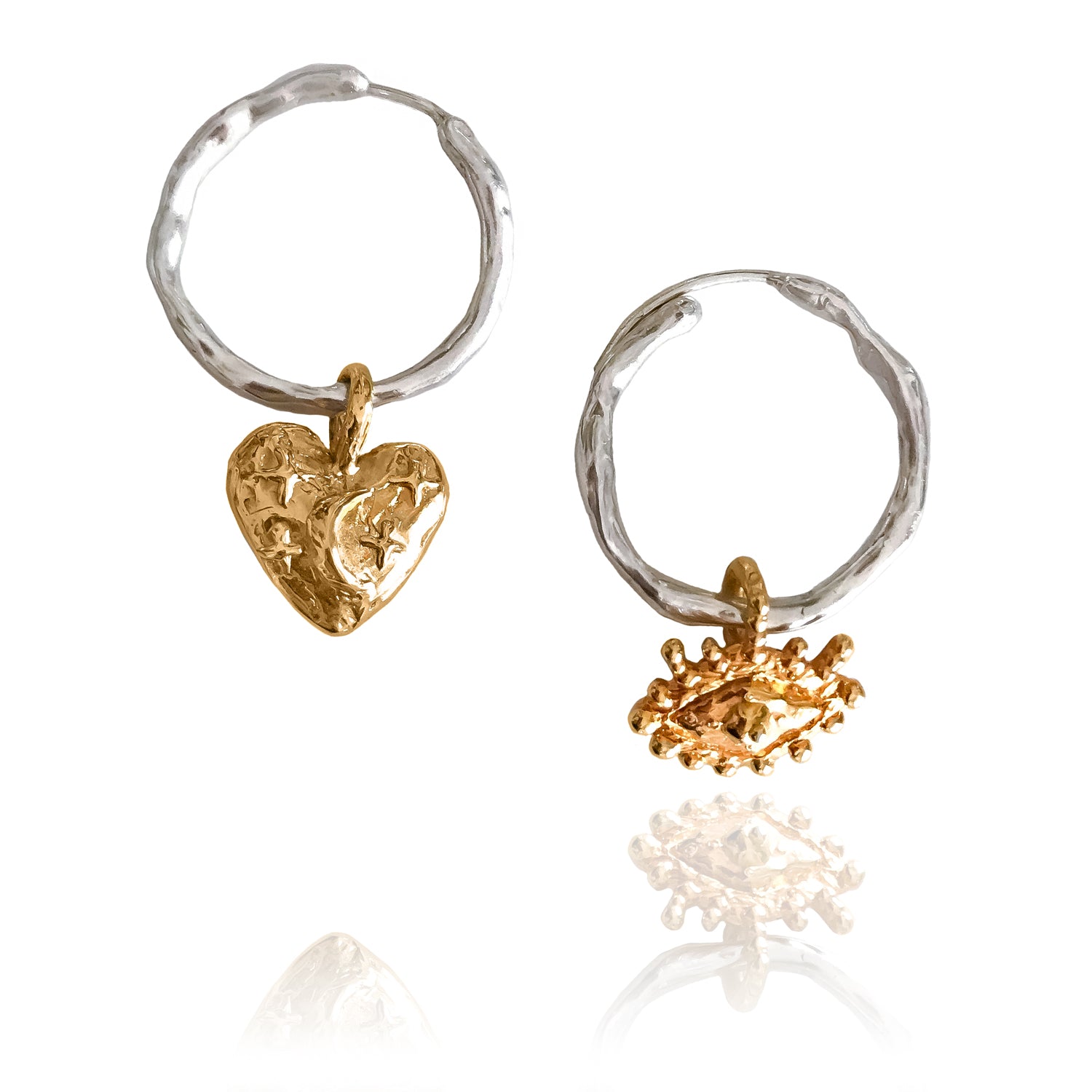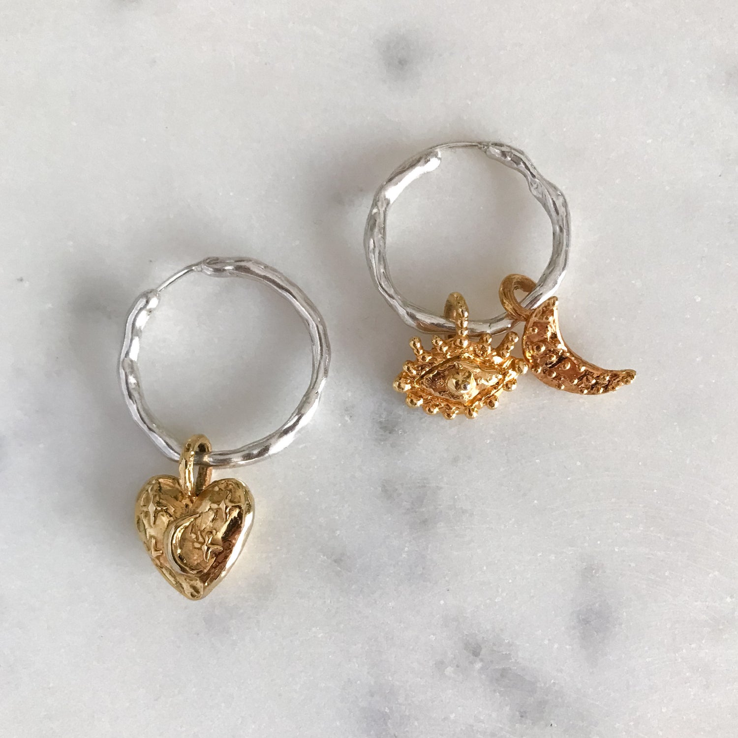 Silver hoops with 3 gold plated silver charms: heart, eye and moon.