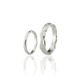 Handcrafted tree bark textured wedding bands available in 14k and 18k gold.