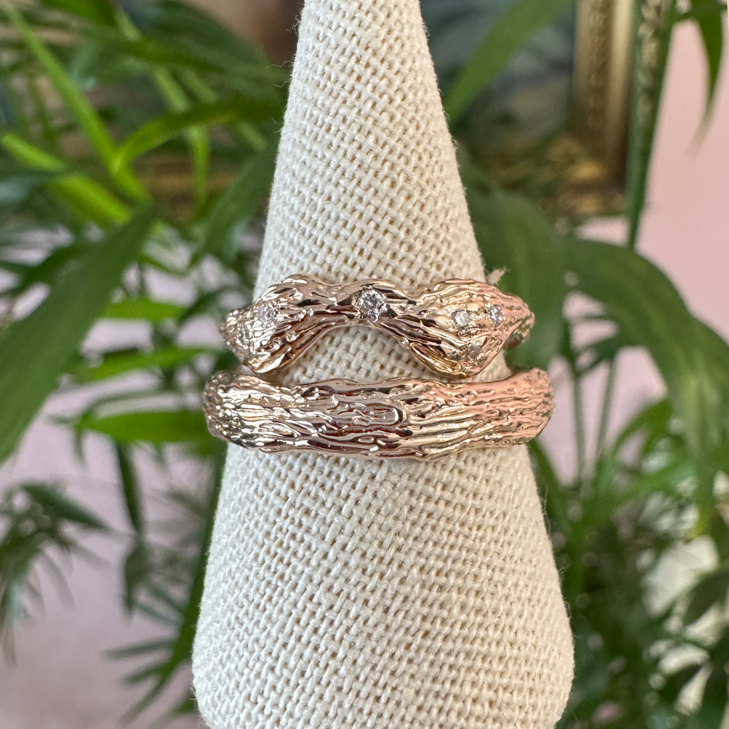Handcrafted branch textured wedding bands available in 14k and 18k gold.